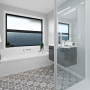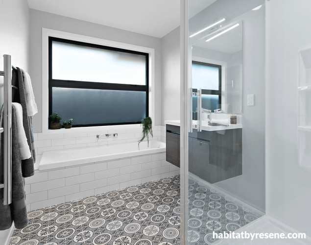 Resene Half Ash in the bathroom ties in with the Moroccan style floor tiling. The ceiling and window trims are in Resene Half Alabaster.