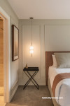 This bedroom has a panelled headboard painted in delicious Resene Half Truffle, with walls in Resene Half Milk White and earthy toned décor for a dreamy neutral space. Design by Lucy Furniss of Lucy Furniss Design & Interiors, image by Someday Photography.