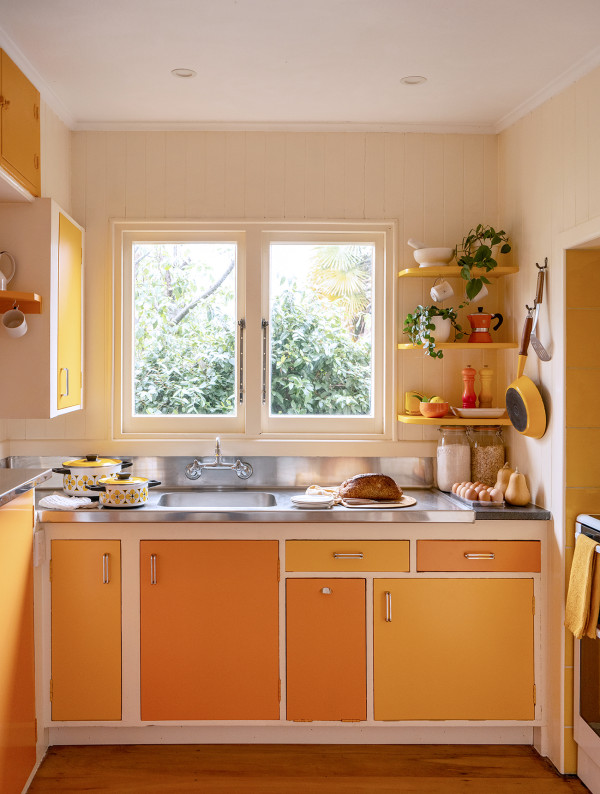 In the kitchen, with its walls of Half Buttermilk, is where warmth settles in again, grounding the space in something familiar and sunlit, while cabinetry in Hero and Buttercup brings a brighter, almost playful contrast.