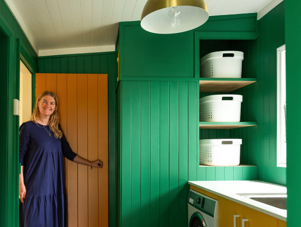Elsewhere, colour becomes more daring. In the laundry, the deep green of Resene Crusoe settles into the vertical wooden panelling, paired with sharp bursts of brightness in Bright Spark. It’s a combination that shouldn’t quite work, yet does, because it feels true to the home’s past life.