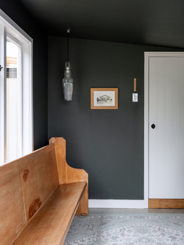 Then there’s the former tool shed, now a hobby room, with its once rough and ready concrete floor, which has been carefully revealed. “It was decided to see what it would come up like if it was sanded… and to our delight it was filled with tiny black and grey river stones that polished up beautifully.” With the walls finished in Resene Possessed, the floor has become its own quiet feature, a reminder of the building’s layered life.