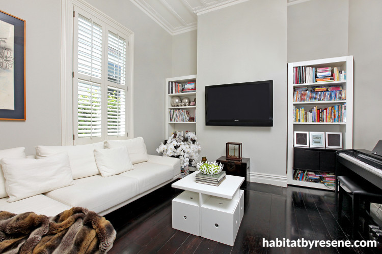 Resene Half Ash is a versatile neutral and it sets off the cool, classy living room to best effect. “Look at the gentle dappling from the trees outside. This is such a peaceful colour,” she says.