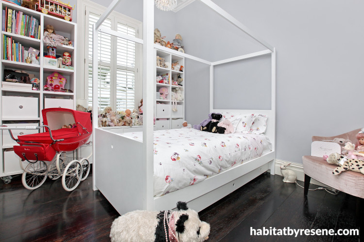 Little Violet’s bedroom with a four poster bed that’s just perfect for this particular princess, has walls in Resene Heather, a cool grey shade with just a hint of purple. “It’s fascinating the way this colour changes all through the day,” explains Penny. “It’s actually at its loveliest in the evening.”