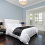 The couple chose Resene Dusted Blue for the walls in the master bedroom, a moody mix of green and blue. Resene Milk White and Resene Porcelain positively glow on the trims and accents.