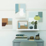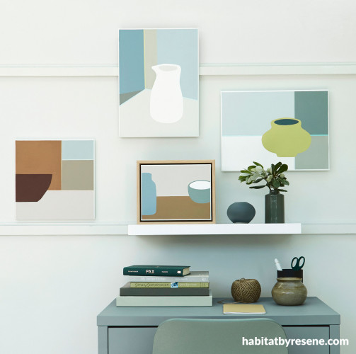This gallery wall features creative abstract art that perfectly complements the Resene Half Dusted Blue walls. The shelf is in Resene Triple Sea Fog and the desk is in Resene Seachange. Project by Greer Clayton. Image by Bryce Carleton.