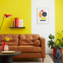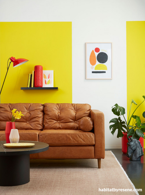 Another way to draw attention to a specific colour in the artwork is to pull out a small detail colour and use it as a starting point for your interior palette. For example, the use of racy red Resene Roadster on the lamp and vase in this room has been inspired by the small red dot in the artwork. Acrylic paintings are often more vibrant, which will allow you more freedom when choosing a bright wall colour.