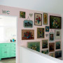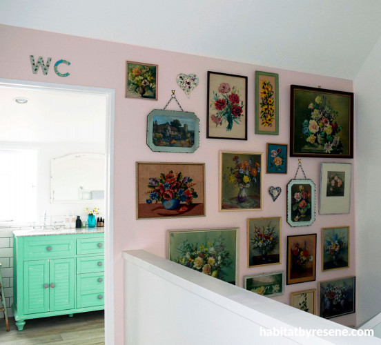 Homeowners Sheryl and Kevin created a feature wall on the stairs with Resene Sentimental walls. This pink peach hue is a great backdrop for Sheryl’s collection of vintage flower art.