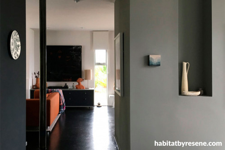 Homeowner Donna created a minimalist art lover’s paradise with walls in Resene Foggy Grey. She painted the left wall in Resene Blackjack.