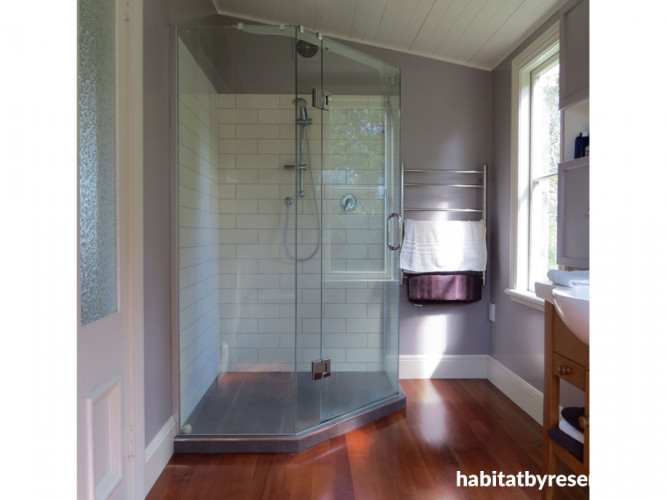 Having painted their bedroom in neutral colours Susan and John Snelgrove felt free to do something a little more daring in their bathroom. Friend and interior stylist Jane Swinard took them way outside their comfort zone, suggesting Resene Nobel to complement their Resene Parchment bedroom. Resene Nobel was more subtle than the other lilacs and mauves they had considered and beautifully frames the garden views from the window. The couple chose cream rather than white tiles to give an old lavender and antique lace look to the room.