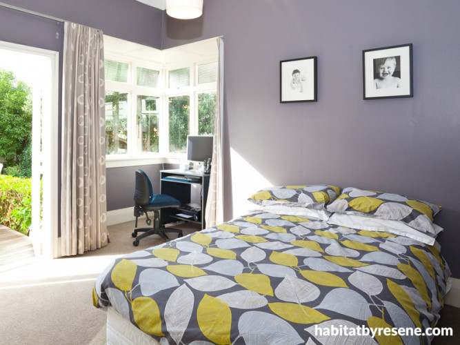 The muted lavender tones of Resene Salt Box complement the green garden outlook in this bedroom.
