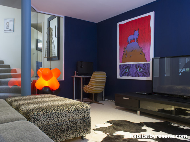 The deep indigo tones of Resene Nite Life are perfect for this moody teenage rumpus room. Designed by homeowner Debra Yearsley, she’s added animal prints, vibrant art and a funky orange light. This house featured in the latest habitat magazine.