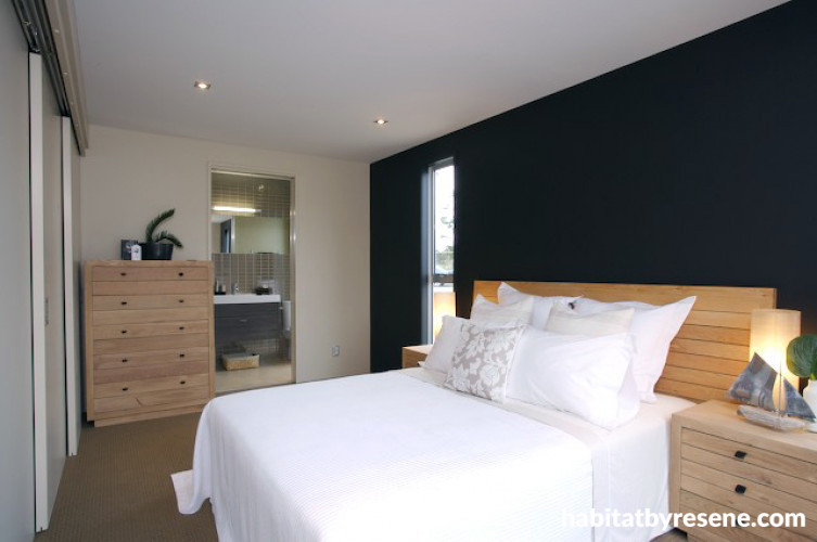 The charcoal black Resene Bokara Grey feature wall in the master bedroom works beautifully with the pale wood furniture. The other walls in this room are painted in Resene Sisal.
