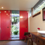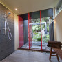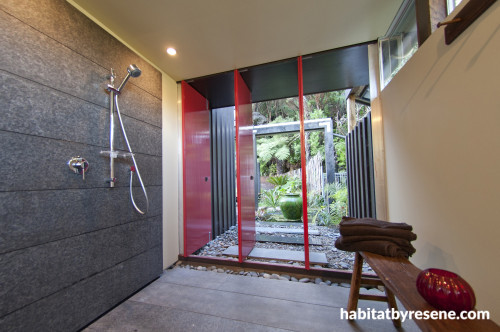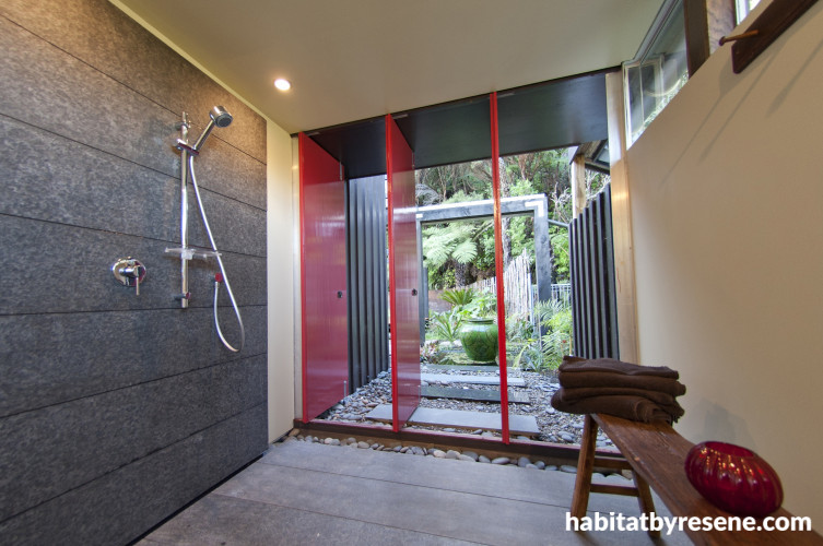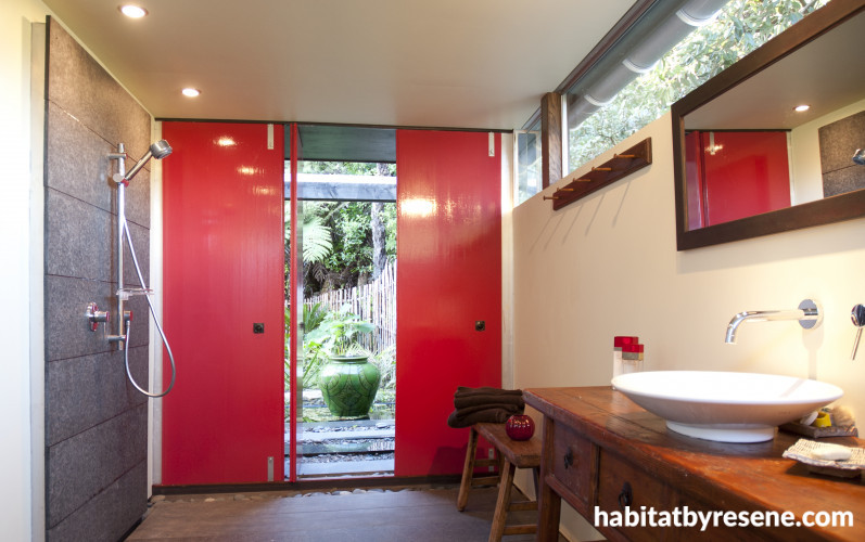 The new bathroom features Resene Paprika red Japanese-style pivot panels which open into the tropical plants and water feature outside. Walls are Resene Miso.