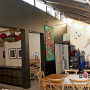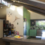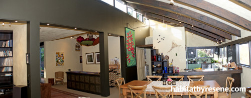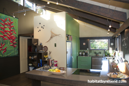 The kitchen, where Resene Hippie Green cabinets echo the green in John and Linley's treasured Batik hanging. The walls in this photo are Resene Top Gear and Resene Butter, while the macrocarpa beams have been stained with Resene Blackwood.