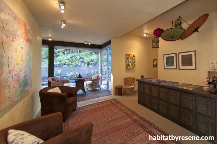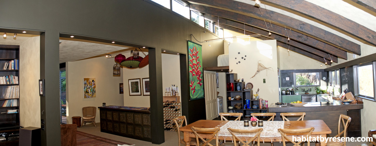Which space do you get your greatest satisfaction from? Our "Raffles Room”. Not a room at all really, but not quite a passage either, it hovers between the living room and the courtyard. It is magical at any time of day and most strongly expresses what we love about some of what we saw in our travels. A place to sit beside the quiet water at breakfast, for a drink with friends in the evening, or to read a book at any time. The dark oak floor and massive macrocarpa beams (stained with Resene Blackwood) give a spa resort feel. The runner-up for favourite space would have to be the bathroom, with its massive open basalt shower opening via three Japanese-style pivot panels into the tropical plants and water feature.