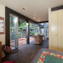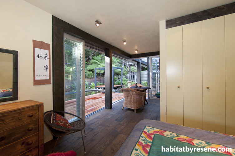 The bedrooms have no doors, in keeping with John and Linley's "as open-plan as we were brave enough to do" concept for the house. The view from this bedroom takes in the sunny north courtyard which now has a fishpond, tropical plants and a pavilion. Inside are Resene Butter walls, oak floors, and macrocarpa beams stained with Resene Blackwood.