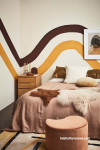 Go for a funky look that channels the 70s with these sweeping stripes. Walls in Resene Anglaise with top stripe in Resene Digeridoo and bottom stripe in Resene Fuel Yellow, floor in Resene Colorwood Bark and vase in Resene Digeridoo. Bedside table, candleholder, bowl and rug from Good Form, duvet from Father Rabbit, pillowcases from Penney + Bennett, cushions from Città, ottoman from Contempa. Project by Amber Armitage. Image by Wendy Fenwick.