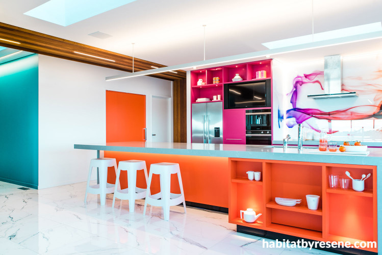 Neil Fenwick Architects won the Residential Interior award for this kitchen featuring Resene Colour Me Pink, Resene Daredevil and Resene Maestro against a neutral backdrop of timber and Resene Black White walls.