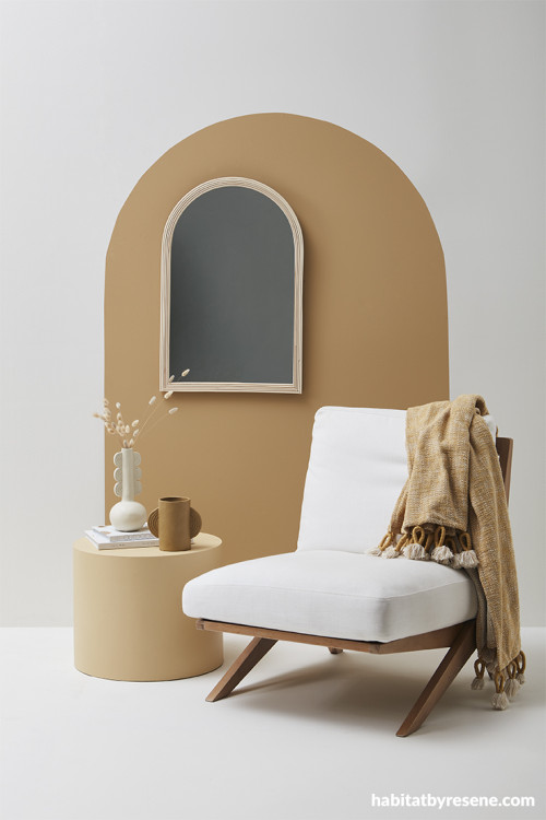 A cosy corner is brought to life with an arch painted wall effect in Resene Papier Mache and wall and floor in Resene Rice Cake. Side table in Resene Putty, tall vase in Resene Quarter Pavlova and vase with arched sides in Resene Bullwhip. Chair from Freedom, mirror from Mocka, throw from Adairs. Project by Vanessa Nouwens. Image by Wendy Fenwick.