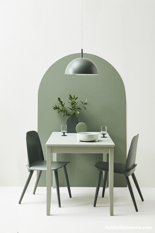 This dining nook features a wall and floor in Resene Rice Cake with the arch painted wall effect in Resene Half Rivergum. Table in Resene Spanish Green, pendant, chairs and arch vase in ReseneMangrove and plant pot and bowl in Resene Pumice. Wine glasses from Nood. Project by Vanessa Nouwens. Image by Wendy Fenwick.