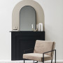 This sophisticated space features an arch painted wall effect in Resene Napa and wall and floor in Resene Rice Cake. Side table, bowl and candleholder in Resene Triple Napa, fireplace vase in Resene Eighth Napa, fireplace in Resene Nero and small arch vase in Resene Tea. Armchair is from Nood, rug from Freedom, mirror from Kmart and bobble candles from Superette. Project by Vanessa Nouwens. Image by Wendy Fenwick.