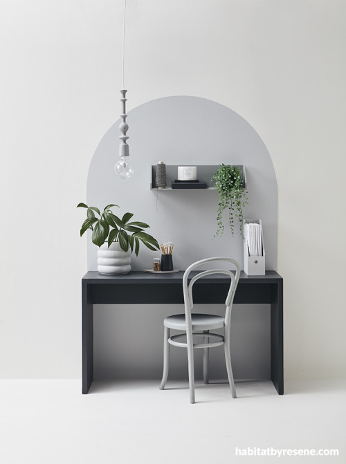If your workspace is feeling flat and leaving you uninspired to sit down for a day’s work, an arch is the perfect way to liven it up. Add flair but keep things subtle and sophisticated with an arch in Resene Surrender. A new backdrop will transform your houseplants too – greens pop against the cool of silver grey and come alive as feature pieces.