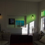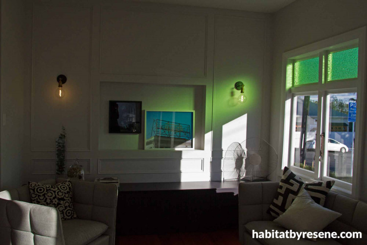 The unique stained-glass windows added in the lounge create a green glow in the afternoon sun against the white walls painted in Resene Sea Fog.