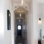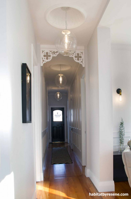 The hallway is now painted in Resene Sea Fog, a timeless white that opens the space, and the Resene Alabaster brightens the ceiling clearly showing the bungalows original detailing. The front door is painted in Resene All Black.