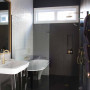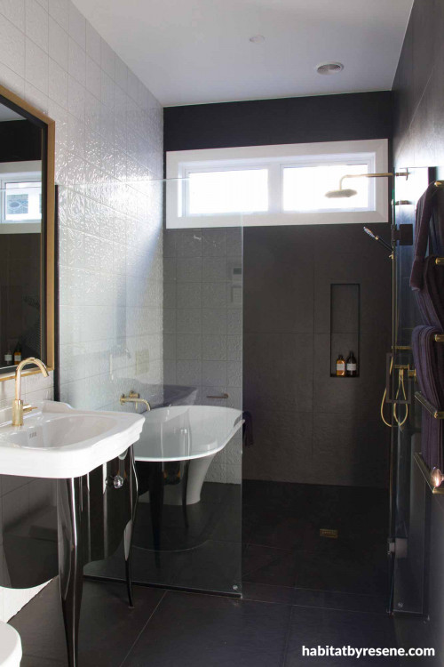 The dark shade of the tiles in this bathroom mimic the grey shade used in the kitchen creating a cohesive look throughout the house, with white tiles on surrounding walls and Resene Alabaster on the ceiling.