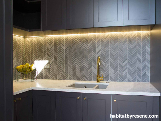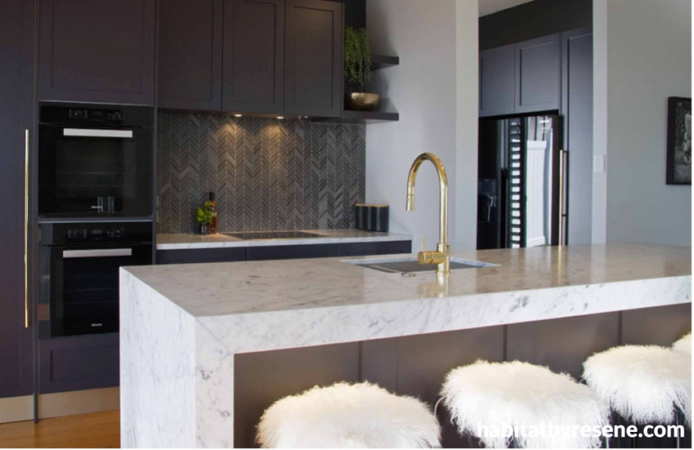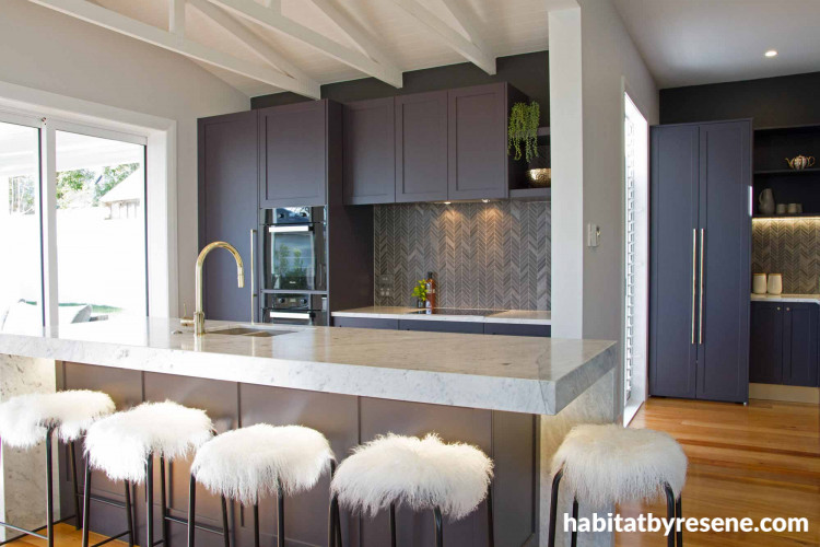 The different grey tones in the splashback tiling and marble benchtop reflect the darker cabinetry as well as the lighter walls painted in Resene Sea Fog, a white with a hint of grey. This is an interior colour palette that was well thought out and implemented with precision.