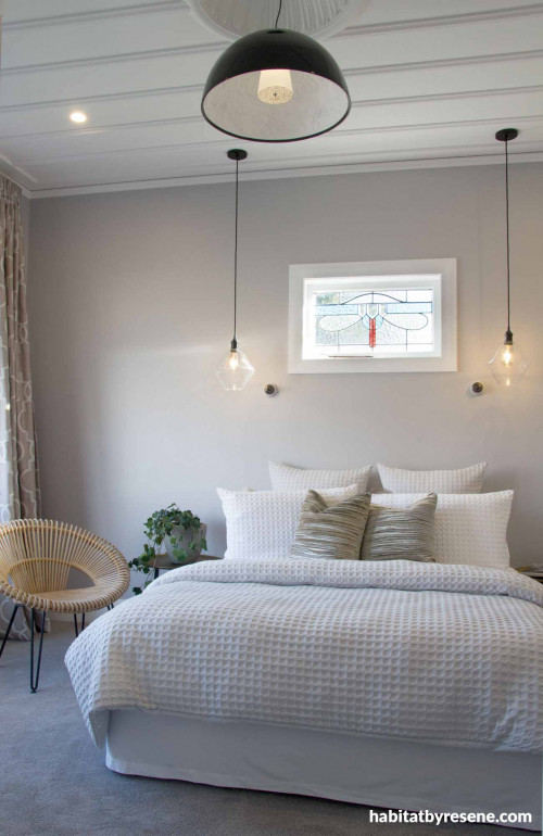 A simple and distinguished silver-grey, Resene Surrender, was used on the walls of this bedroom. This calm and serene shade pairs well with the Resene Alabaster ceiling and neutral fabrics and décor.