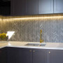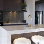 The striking charcoal grey kitchen with a blue edge creates a modern vibe in this 1930s bungalow. Resene Fuscous Grey was used in the kitchen, with Resene Sea Fog on the walls and Resene Alabaster on the ceiling. The gold finishes add a touch of luxury to this contemporary space.