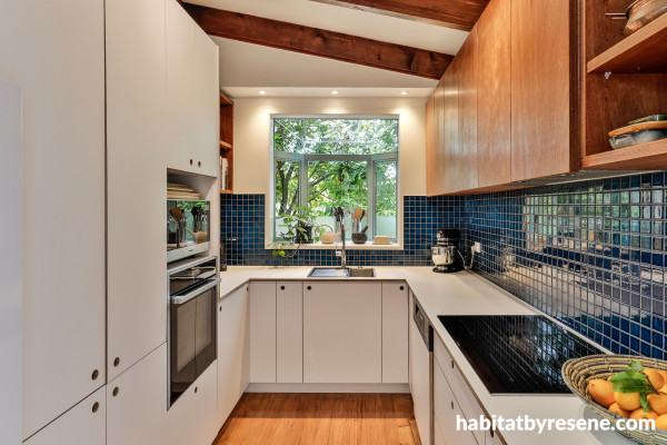 A fresh new kitchen with ocean blue tiles and feature timber cupboards. The walls and ceiling are painted in Resene Half Merino and trims in Resene Sea Fog.