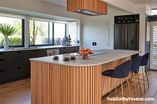 One of the main ideas for this project was to turn the kitchen into the hub of the home – a space for family gatherings, entertaining friends and daily meals. This space had a complete overhaul, with specific emphasis on functionality, durability and a nod to the mid-century era. The curved island bench, adorned with vertical oak battens, not only makes a bold statement but also creates a connection to the home's architectural roots. The incorporation of these battens above the island cleverly conceal the extractor fan while turning it into a distinctive design element.