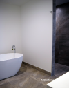 The ensuite, painted in Resene Alabaster. The couple likes the colour’s fresh neutral look, choosing to add colour with accessories.