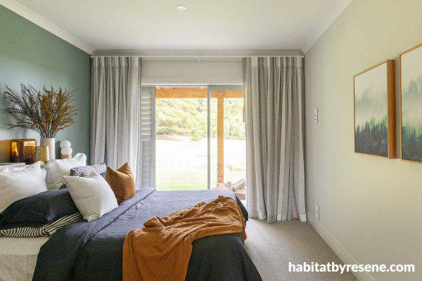 Walls in Resene Quarter Merino surround the tongue-and-groove feature wall, softening Resene Blue Smoke’s dense, foggy hue. Down the rustic Resene Quarter Merino hallway lies a forest oasis in the spare bedroom. Walls in Resene Quarter Merino reflect the minty hue of the Resene Half Washed Green feature wall. “It is a generously sized house and the bedrooms needed to have some warmth and colour in them,” says Kate. “I was so lucky with these clients as they completely trusted me and the process.