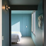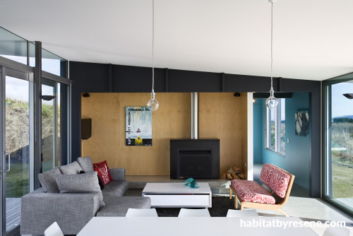 The two main bedrooms open off the living space through oversized doors that allow views and light to be shared but can be enclosed away when the sliders are shut. The vibrant blue shade of paint (based on Resene Juniper) was initially a mis-tint, but the owners loved it so much, they kept it. The hallway lights were created by Gerald Parsonsen, and feature special mirror bulbs to reflect light back onto the wall.