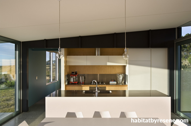 Great thought went into the lights over the dining table – the owners wanted something simple, which didn’t distract from the view but still looked elegant. “We couldn’t find anything we liked, so in the end we came up with our ‘Tribute to a naked bulb’,” says one. The copper fixture was covered with brass, and fitted with clear dolly bulbs. Originally the kitchen was meant to be more ‘camping style’, but after adding the island bench, the owners find they enjoy cooking more often.