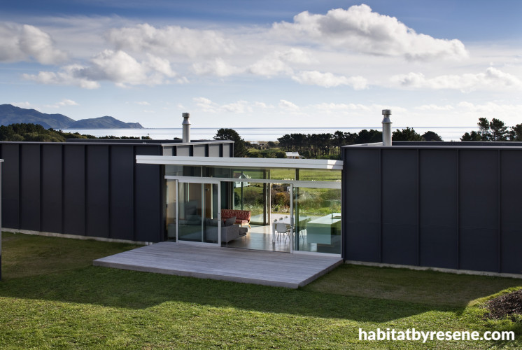 The exterior colour was inspired when the builder put up the building paper around the house. Seeing the dramatic effect, the owners opted for a much darker shade (Resene Cod Grey) than they had originally envisaged. “The paint is weathering really well – it has a special reflective quality that stops it from heating up too much and as a result it is not fading either,” says one owner.