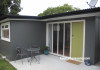 The exterior of the sleepout is painted Resene Gravel with a Resene Wasabi door.