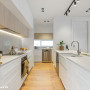 Meg & Dan’s kitchen design employs clean lines through the cabinetry and spotlights. The walls, ceiling and trim are in Resene Black White.