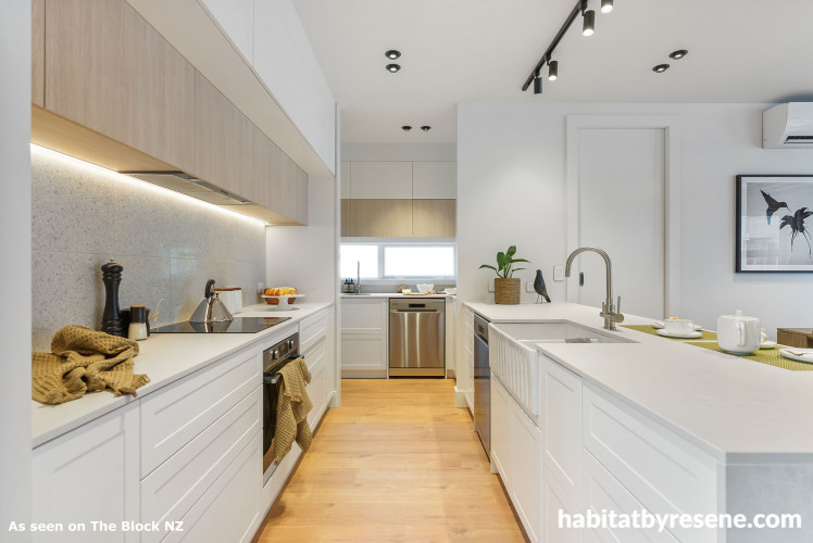 Connie & Rach continued their use of elegant Resene Barely There on the kitchen ceiling and trim, where it accentuates the cabinetry.