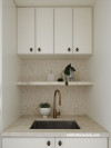 The laundry features a mosaic stone splashback with soft warm tones to complement the cabinetry and walls in Resene Double Rice Cake.
