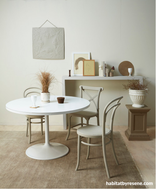 Layering of neutrals with walls in Resene Half Spanish White, floor in Resene Colorwood Whitewash. Sideboard painted in Resene Eighth Stonewashed, chairs painted in Resene Napa, plant pot painted in Resene Half Spanish White and plant stand painted in Resene Artisan. Rug from Armadillo & Co at the Ivy House, artwork by George Stand Studio from Endemic World. All other items are stylist’s own. Styling by Kate Alexander, photo by Bryce Carleton.