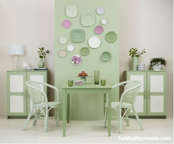 A curated collection sets the scene in this dining room combined with left and right walls painted in Resene Eighth Fossil, main wall painted in Resene Norway and flooring painted in Resene Quarter Fossil. Cabinets in Resene Norway with inner door panels in Resene Rice Cake. Dining table painted in Resene Highland, rattan chairs painted in Resene Pale Leaf, and plates painted in Resene Amulet, Resene Pale Leaf, Resene Norway, Resene Rice Cake, Resene Lola, Resene Butterfly, Resene Antidote and Resene Highland. Jug vase (sitting on book pile) and tall vase in Resene Highland. Large jug vase with leaves in Resene Pale Leaf. Ribbed planter and small dish in Resene Lola. Glasses from Citta, glass table lamp from Kmart, floral bowl and plate from Bolt of Cloth. All other items are stylist's own. Styling by Vanessa Nouwens, photo by Bryce Carleton.