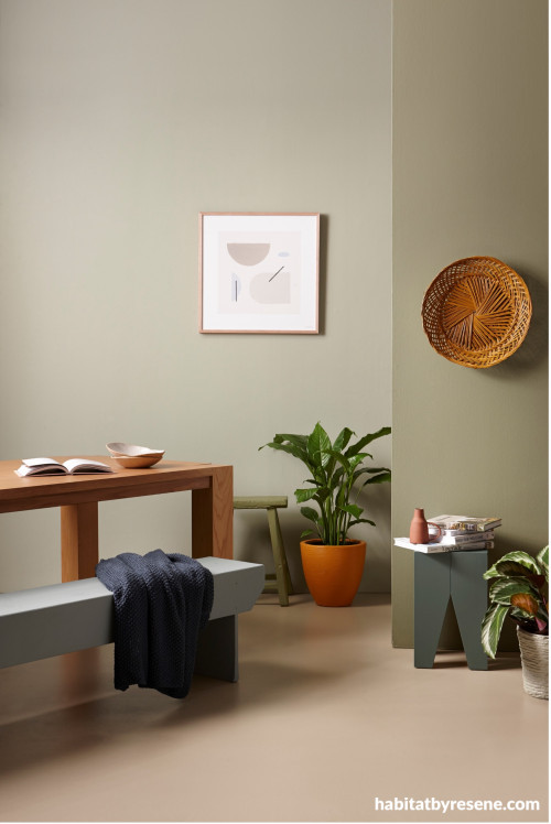 Are greens the new neutrals? This simple, yet dynamic dining room is created with a handful of green hues including Resene Bud on the backwall, Resene Siam on the side wall and floor in Resene Cargo. Bench seat in Resene Innocence, peg stool in Resene Jurassic, stool in Resene Woodland, straw wall hanging in Resene Rusty Nail, plant pot in Resene Mai Tai and basket planter in Resene Double Lemon Grass. Dining table and bench seat from Freedom Furniture, vase from Everyday Needs, books, bowl and throw from Paper Plane, plants from Palmers, jug from Blackbird Goods, artwork from Endemic World. Styling by Gem Adams, image by Wendy Fenwick.