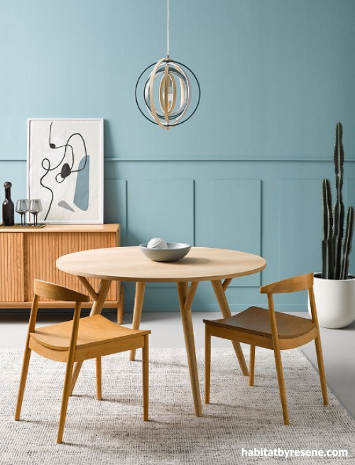 Soothing blue walls in Resene Ziggurat and floor painted in Resene Mountain Mist. Plant pot in Resene Celeste, bowl on table painted in Resene Nebula and bowl ornament (in bowl) in Resene Half Duck Egg Blue. Bentwood light fixture painted in Resene Half Duck Egg Blue, Resene Blue Bayoux and Resene Rolling Stone. DIY artwork in Resene Celeste, Resene Nocturnal, Resene Rolling Stone, Resene Blue Bayoux and Resene Alabaster with frame in Resene Half Duck Egg Blue. Dining table, chairs and sideboard from Freedom Furniture, rug from Nood, glassware from H&M Home. All other items are stylist’s own. Styling by Laura Lynn Johnston, photo by Wendy Fenwick.