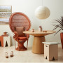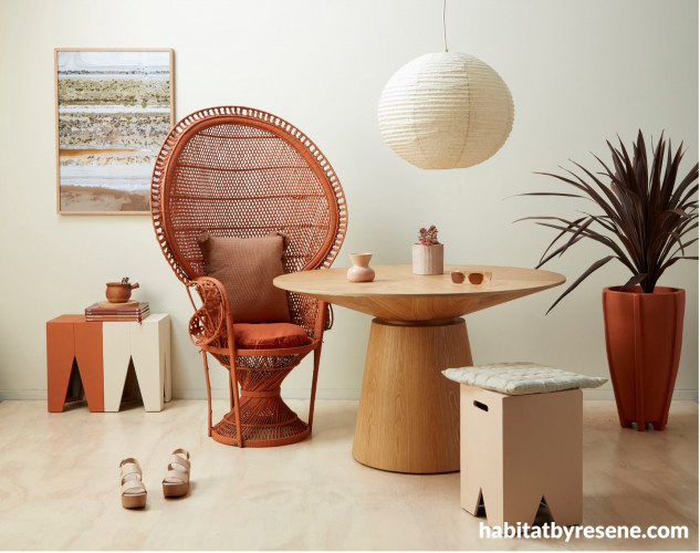 The cute peg stools join in on the fun by bridging the gap between the creamy walls and the statement chair – each one painted in a different but complementary colour. Resene Shabby Chic, a faded pinky peach, is feminine without being girly, while Resene Despacito adds a delicate shade of blush beige to the room. A desert palm, contrasted beautifully against the Resene Sunbaked-painted pot, is a perfect wink to the California vibes of this cool retro room.
