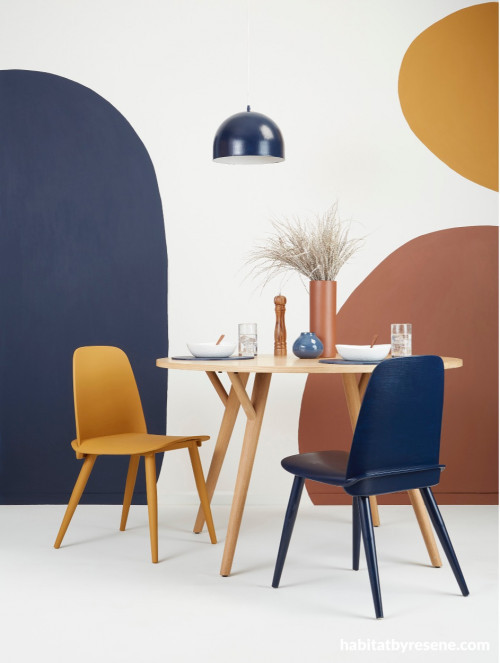 Why choose one colour, when you can have more? Main wall colour and floor colour in Resene Merino, top right circle in Resene Swiss Caramel, bottom right circle in Resene Route 66 and left circle in Resene Indian Ink. Pendant lamp, wooden placemats and concrete bowl all in Resene Indian Ink. Large tall vase in Resene Route 66. Dining table and blue vessel from Freedom Furniture, salt & pepper grinder and placemats (painted in Resene Indian Ink) from Kmart. All other items are stylist’s own. Styling by Vanessa Nouwens, photo by Bryce Carleton.
