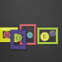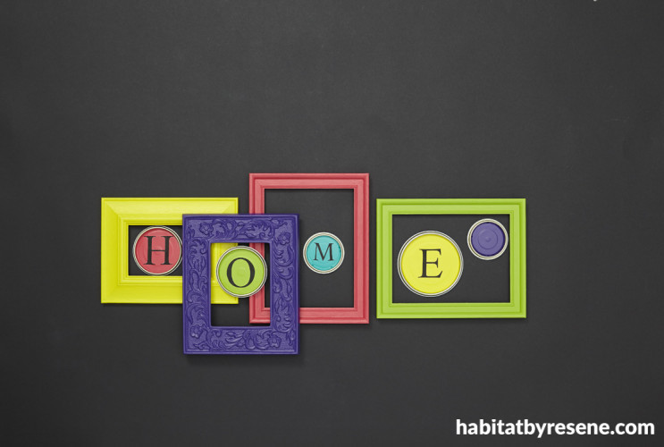 In this scheme, the letter home is showcased on lids painted in Resene Knock Out (pink), Resene Limerick (green), Resene Seeker (turquoise) and Resene Southern Cross (yellow), with a ‘full-stop’ lid in Resene Pukeko. Those same colours are used to paint a variety of frame styles, then the whole composition is hung on a wall of Resene Foundry. We used Resene Blackjack for the lettering.